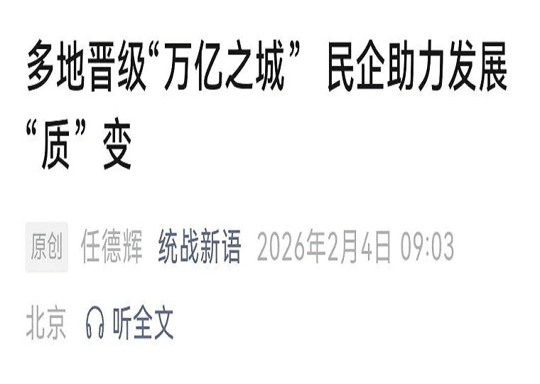 2月4日,中央统战部官方宣传平台“统战新语”发表文章《多地晋级“万亿之城”,民企助力发展“质”变》,聚焦地方经济高质量发展中的民营经济力量。
